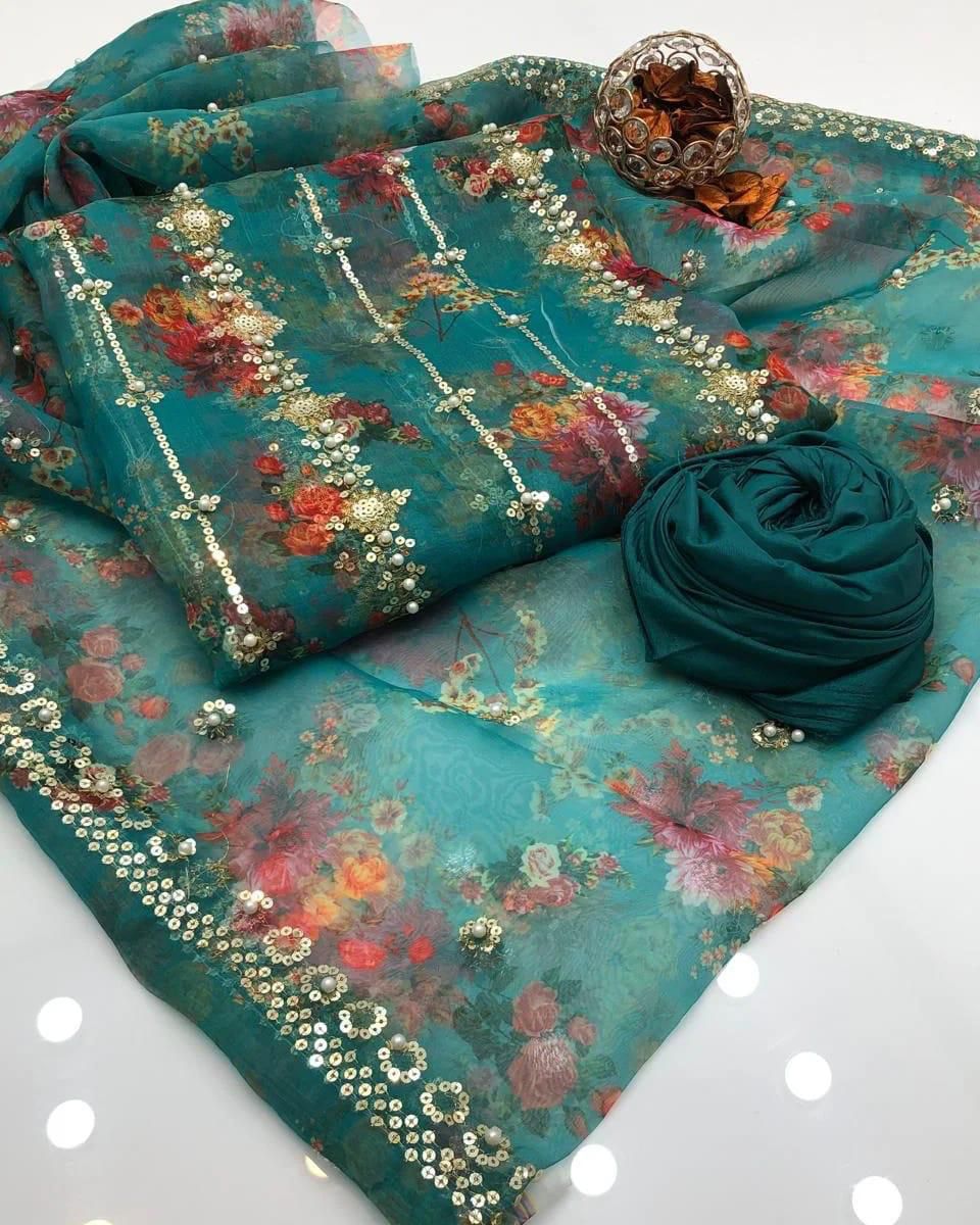 Organza digital print pearls &border work duppata