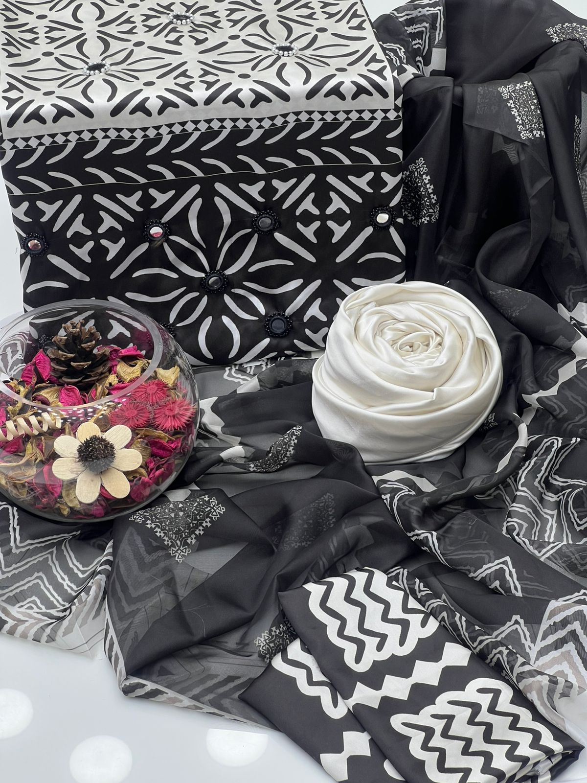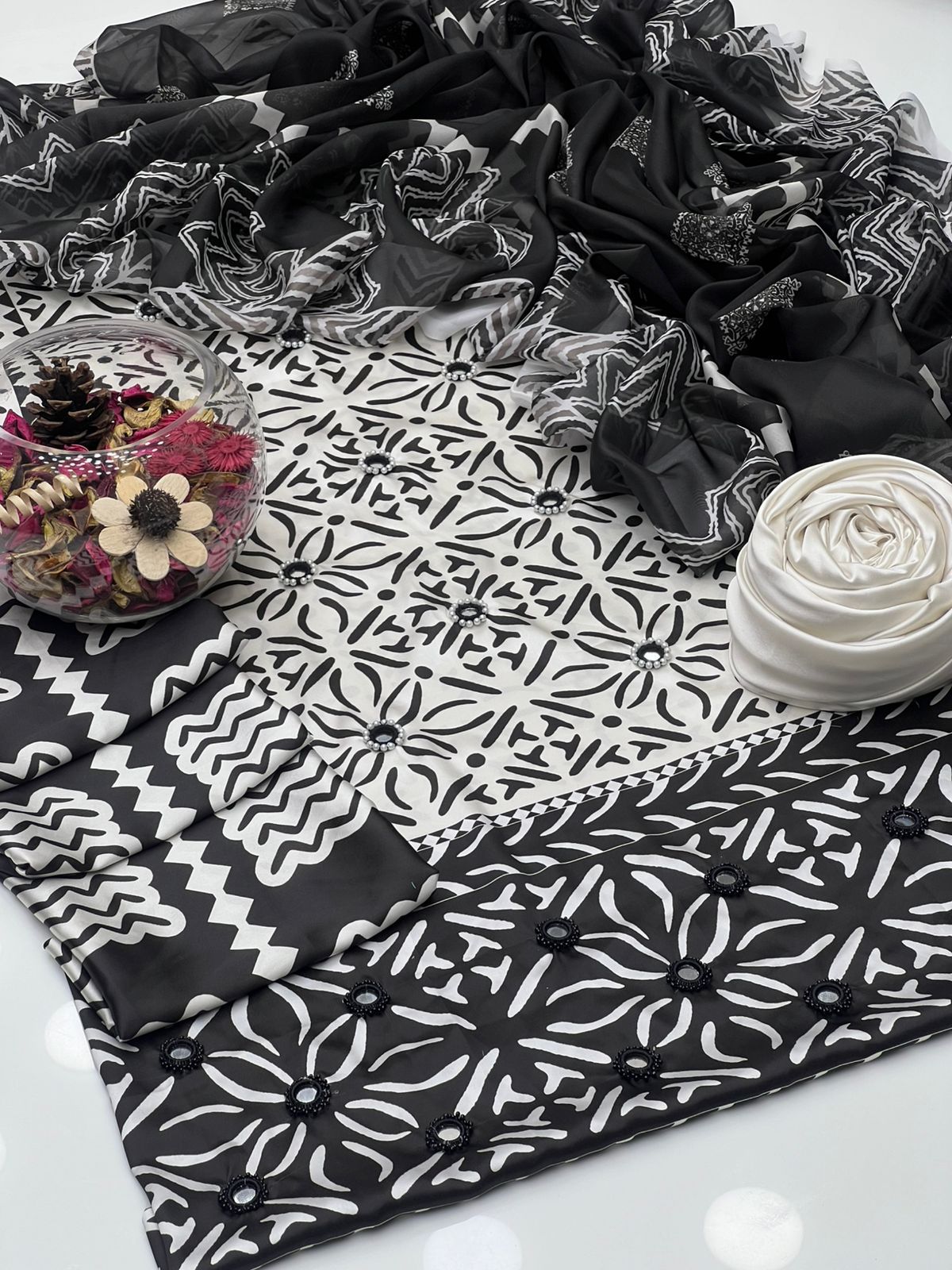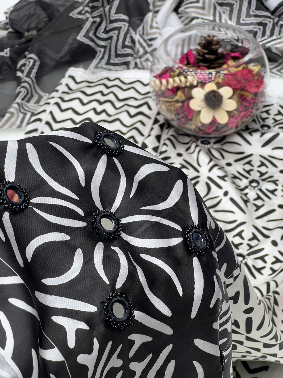 Shamoze Silk Digital Print Front Mirror Beats Work Shirt With Digital Print Sleeves With Simple Shamoze Silk Trouser Along With Silk DigitalPrint Dupatta 3Pcs Dress